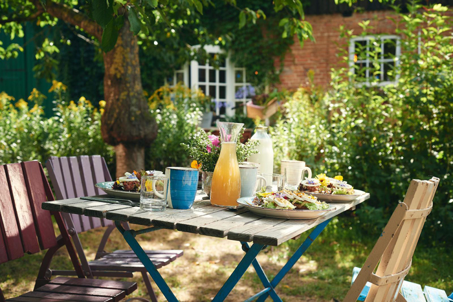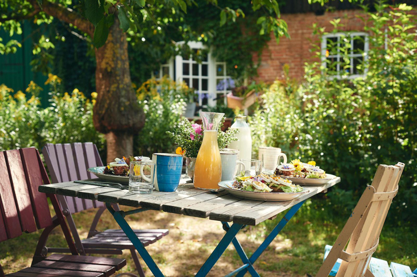 Ein Buffet, mit viel Liebe erdacht und zubereitet, voll hausgemachter, regionaler Köstlichkeiten, klassisch und modern, warm und kalt, süß und herzhaft, alles in Bioqualität mit vegetarischen und veganen Optionen und für alle die, die es deftig mögen, von Jörg, unserem hofeigenen Metzger, selbst hergestellte Fleisch- und Wurstspezialitäten vom Mecklenburger Wildschwein. Auch selbstgemachte Limonade, Kräuterwasser, Tee und Filterkaffee sind im Angebot enthalten.